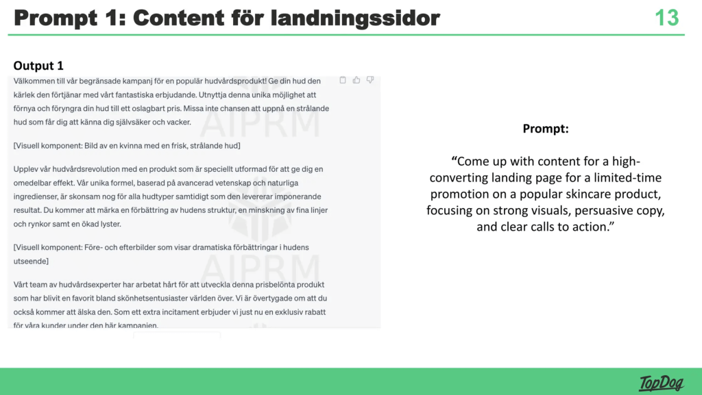 Det sägs att “man får vad man frågar efter” – det gäller verkligen med ChatGPT. En tydligt formulerad prompt ger bättre output. Här är de fem konkreta mallar (”recept”) som Topdog delar i sitt webbinarium: