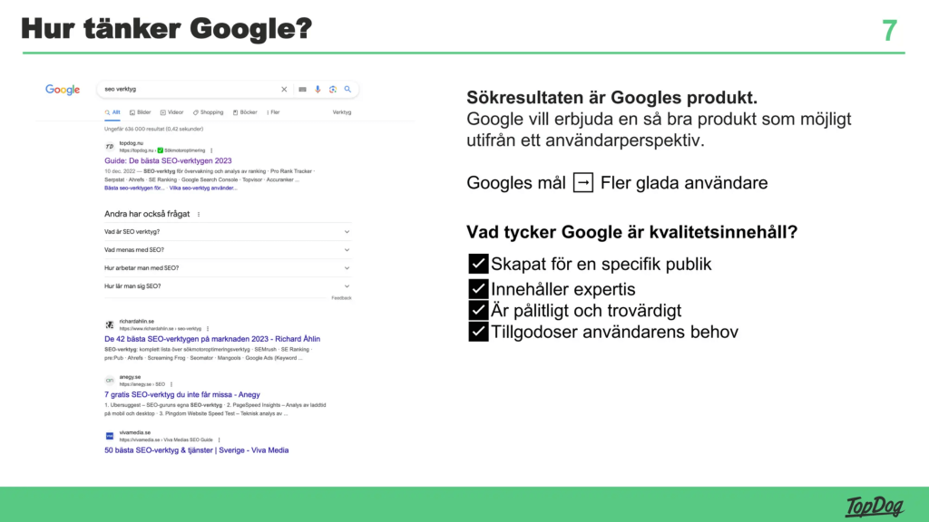 Google ställer tydliga krav: kvalitetstexter ska vara målgruppsanpassade, innehålla expertis, vara pålitliga och täcka användarens behov. Dessa principer sammanfattas i det så kallade E-E-A-T-begreppet – Experience, Expertise, Authoritativeness, Trustworthiness.